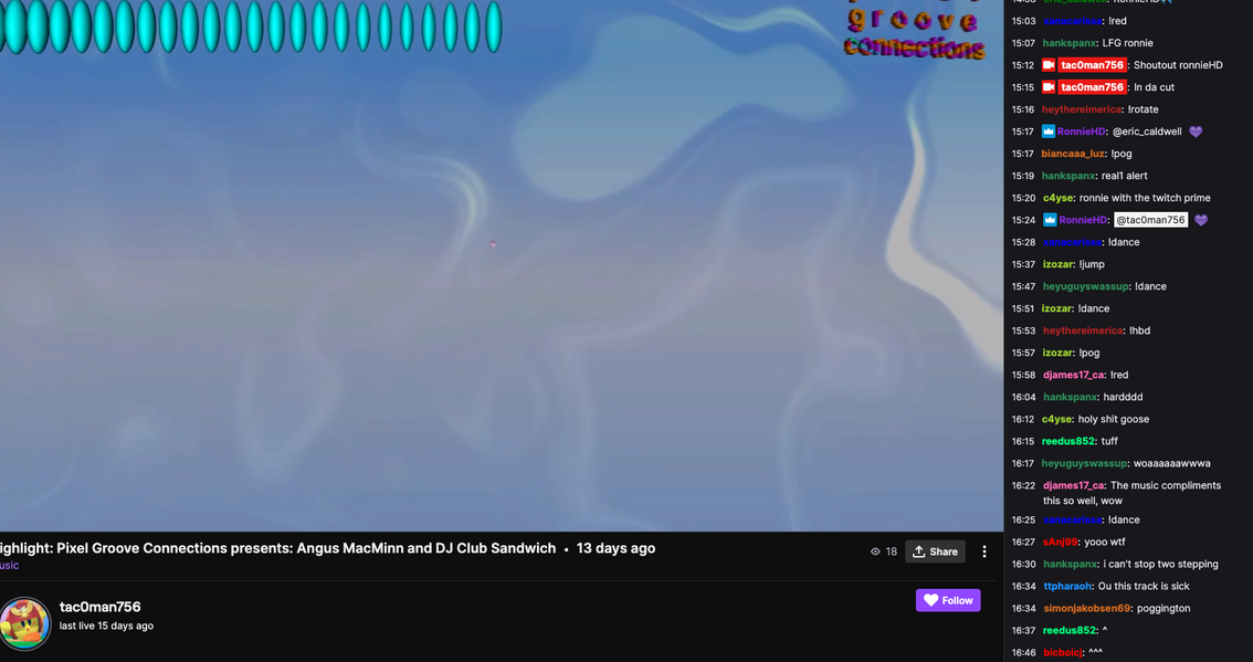 Overview: For my capstone project for my Digital Communications program at Humber College I created an interactive audio-visual performance called Pixel Groove Connections. Over the past year, I’ve grown a passion for creating visual art and animations using the software Touchdesigner. Touchdesigner is an incredibly powerful software that allows for so much more than just creating pretty colours and moving shapes (although that’s all I had really used it for). I originally wanted to create some sort of physical, live interactive event or installation for this project, but was unable to due to the ongoing pandemic and health and safety protocols. This was the first of a few challenges that I had to overcome while working on this project, but I soon realized that I could still create something I was passionate about by taking it to an online setting. I came up with the idea of an audio-visual performance, where I could stream a live set of my visuals to some music on Twitch. I wanted this to be a simulation of the feelings and emotions felt during an in-person rave/concert, and to use music and visuals to recreate those feelings that can’t be felt due to the pandemic. I thought this would be a good start for the livestream, but I really wanted to add a level of audience interactivity to it so that it could stand out from being just a regular livestream performance. This however deemed to be one of the greater challenges, as I had never done anything like this before. I knew it was possible though, and that there were resources out there, which gave me the confidence to go through with it. The stream ended up being pretty successful with 43 viewers at its peak. The interactive commands that I created for the audience to use we’re pretty good too, but definitely not perfect. I had a vision in mind for a specific way I wanted them to work, but unfortunately I couldn’t figure it out in time. Overall when considering it was my first time putting together a project like this, I’m pretty happy with the result.